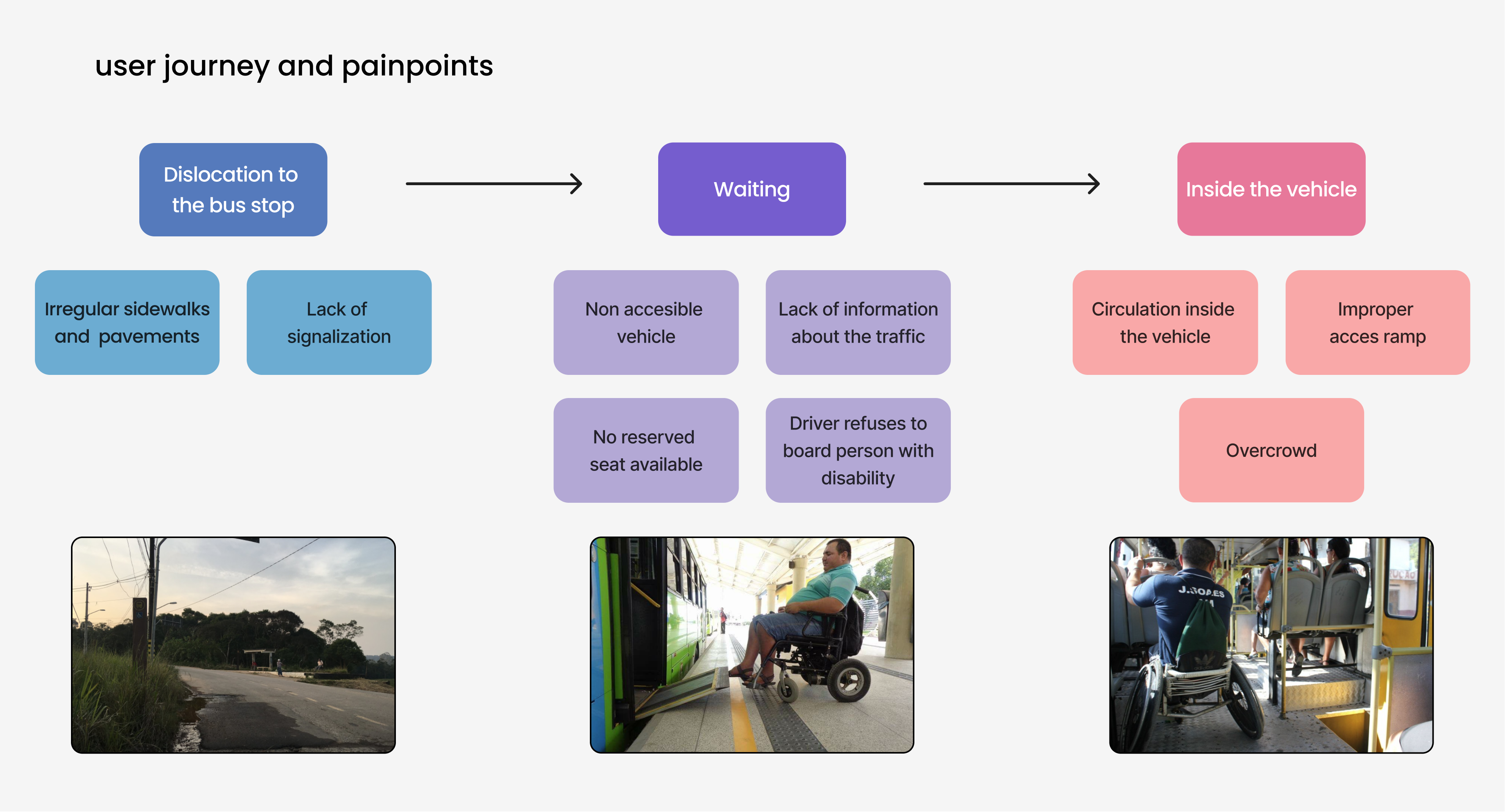Itinerante is an academic project developed at University of Sao Paulo (USP) for the courses ‘PRO3611 Feasibility and Project Management in Design’ and ‘AUT2514 Regulation, technical standards and professional ethics’. For this project we were asking ourselves: How can we use design to build a human centric, smart and accessible city? To answer this question we started doing desk research on demographic data and local legislation regarding accessibility in Sao Paulo, Brasil. We also observed how is the experience of people with disabilities using the public transportation in Sao Paulo and mapped the painpoints we observed throughout the user journey.