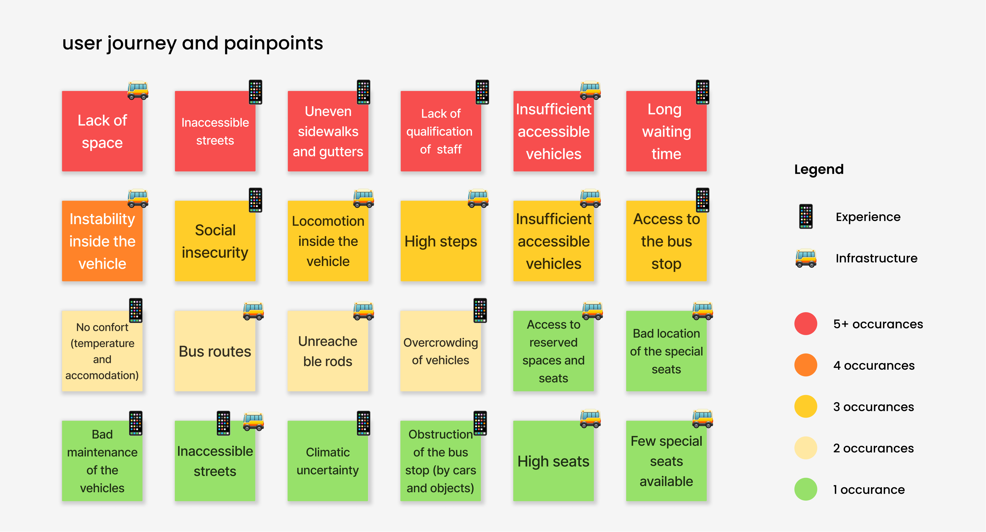 To validate the hypothesis we raised and better understand the users pains and needs, I conducted interviews with 18 people with mobility disabilities that live in the city of Sao Paulo. Among the respondants 93,8% agreed that they face difficulties when using the public transportation system (the other 6,2% don’t use the public transportation at all) it was shown that public transportationis not their main mean of transportation, being car (individual and shared) the most used among the respondents. We also got a wider perspective of the pains they face on their daily commuting journey, and mapped those pain points in two categories: infrastructure and experience. After this analysis we defined the project requirements.